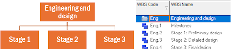 The above image depicts the WBS for our example project in two ways. The firs image is the diagram of the hierarchy commonly used in texts. The diagram on the right is how WBS is represented on P6.